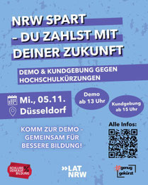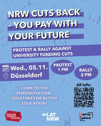 Weitere Informationen zur Demonstartion und Kundgebung findest du auf der Webseite vom Landes-ASten-Treffen: https://latnrw.de/2025/09/29/stoppt-den-kahlschlag-an-unseren-hochschulen-demo-und-kundgebung-am-5-11-in-duesseldorf/